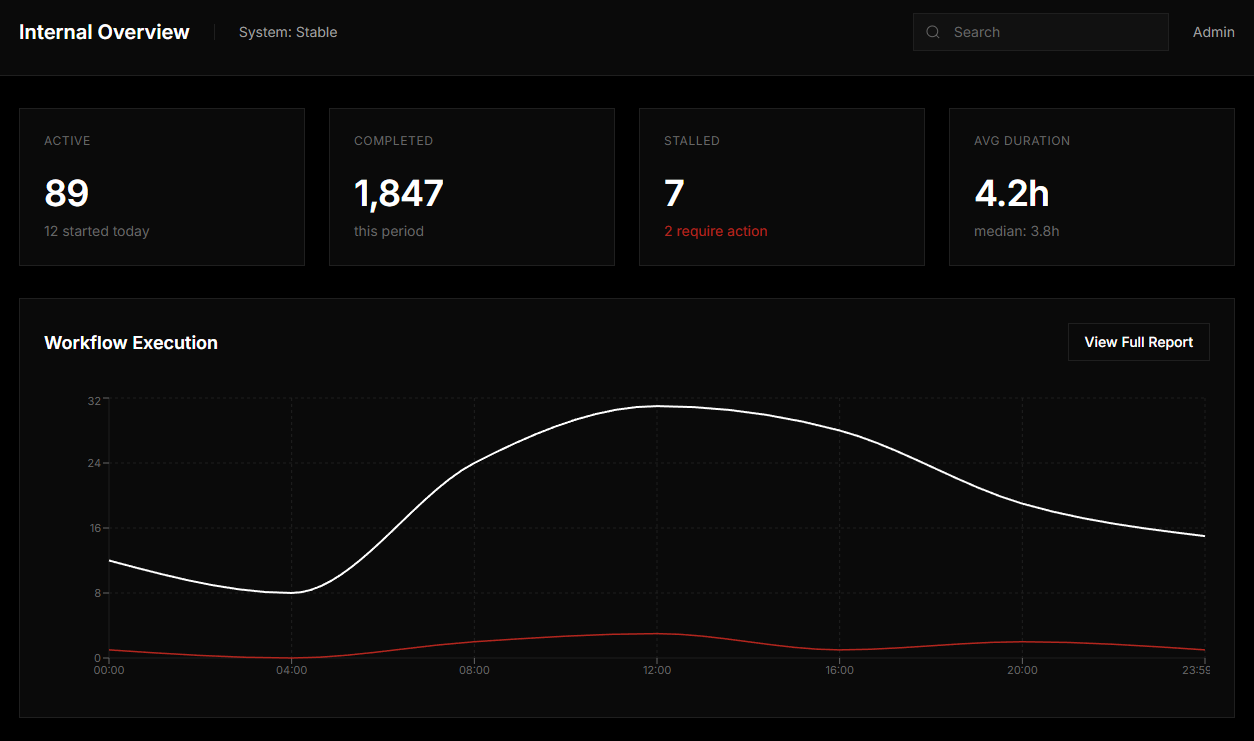 Internal monitoring and operational overview system designed to surface system state, activity, and exception conditions.